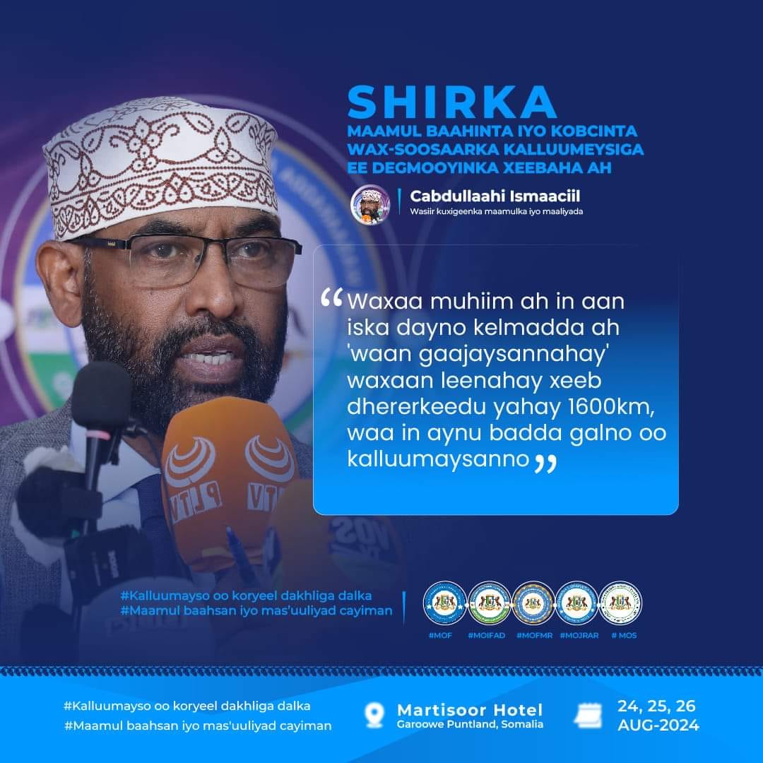 GAROOWE – Ku simaha Madaxweynaha ahna Madaxweyne Kuxigeenka Dowladda Puntland HE Ilyaas Cismaan Lugatoor oo soo xiray Shirka Maamul baahinta iyo kobcinta wax-soosaarka Kalluumeysiga ee degmooyinka ku yaal Xeebaha Puntland.
