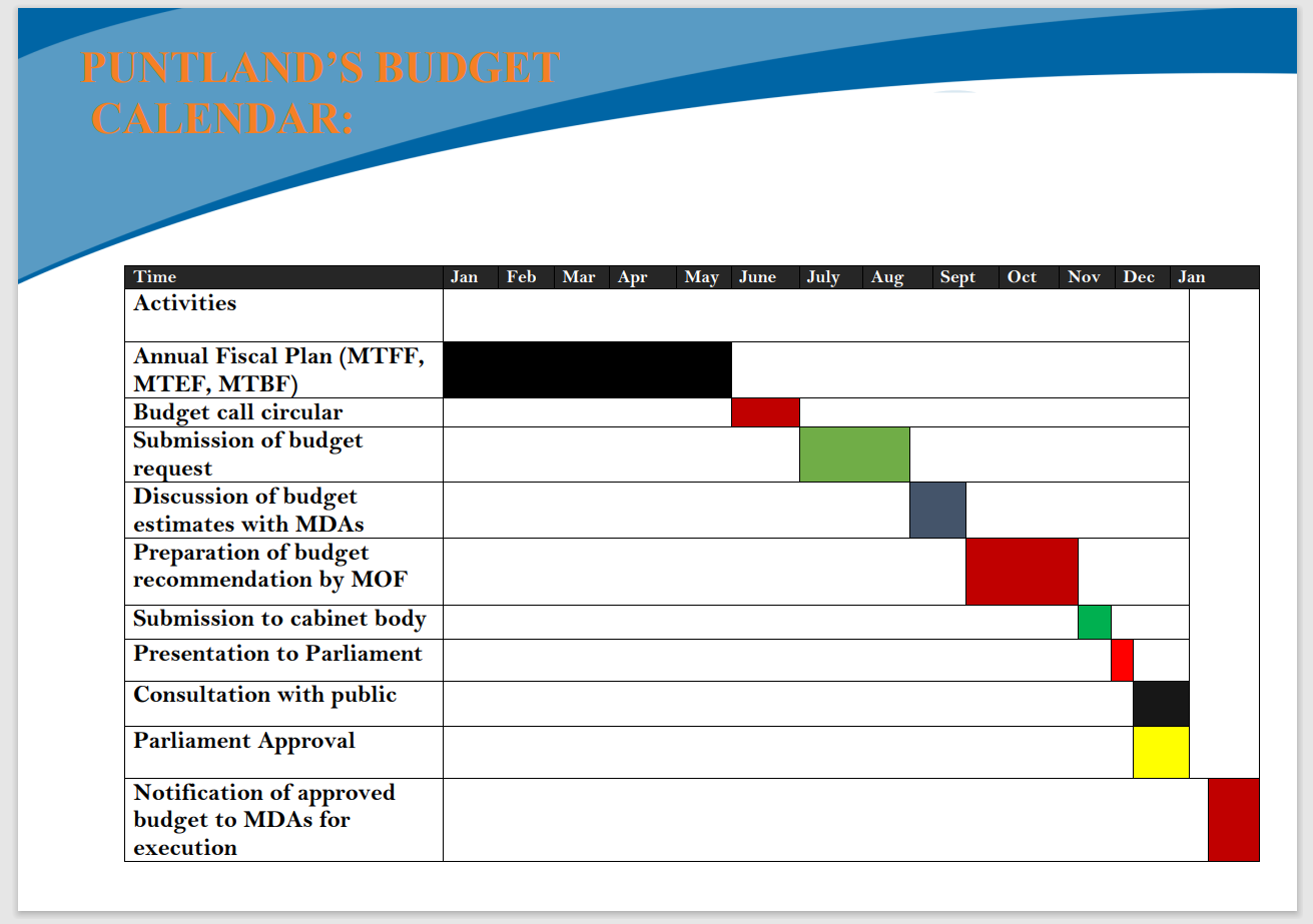 The Budget Department is responsible for leading and coordinating the State budget. The Department has the mandate to formulate annual State budget, conduct mid-year budget review, facilitate budget preparation, revisions, conduct monitoring and control budget using PFMIS country system>The Department is responsible for coordinating with all MDAs, Ministries, Districts and Agencies, on the draft budget.