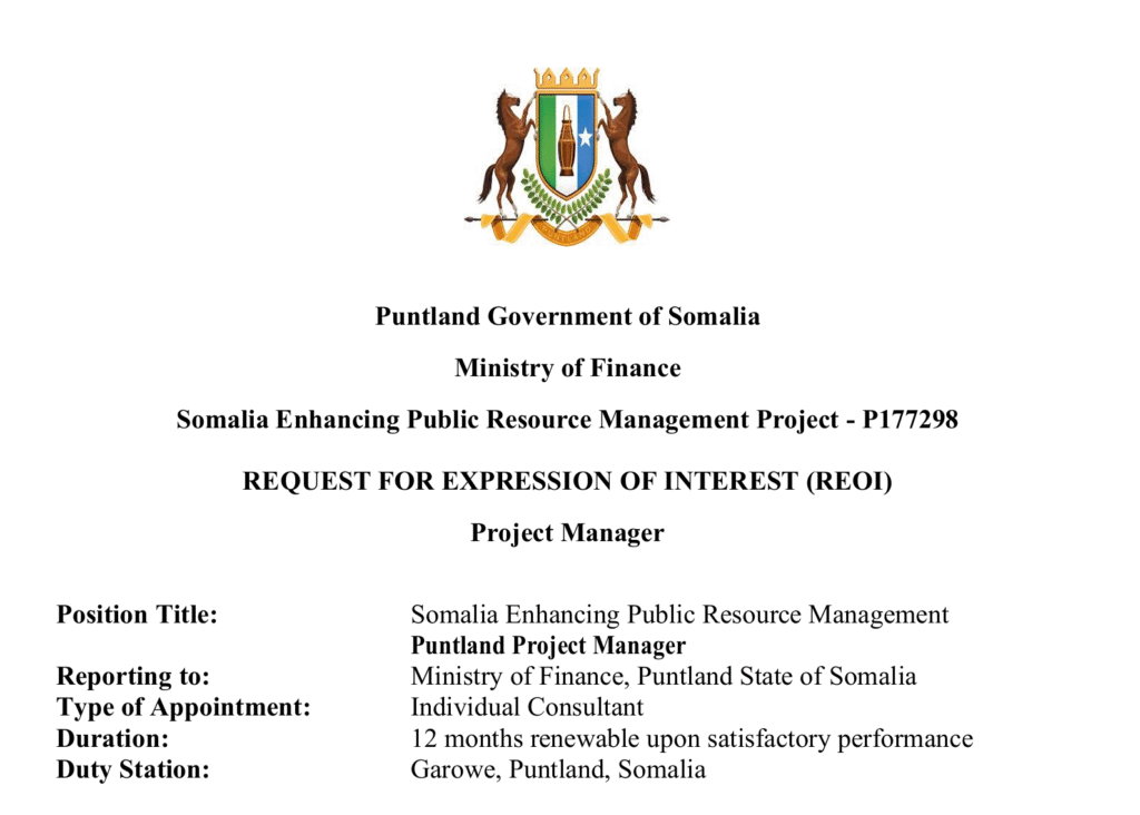 September 23, 2025 / Burale / 0 Comments REOI Puntland-SERP Project Manager Contract Garowe, Puntland Posted 1 month ago Applications have closed Website MOFPuntland Puntland Ministry of Finance REOI Puntland-SERP Project Manager 1 file(s) 236 KB Download