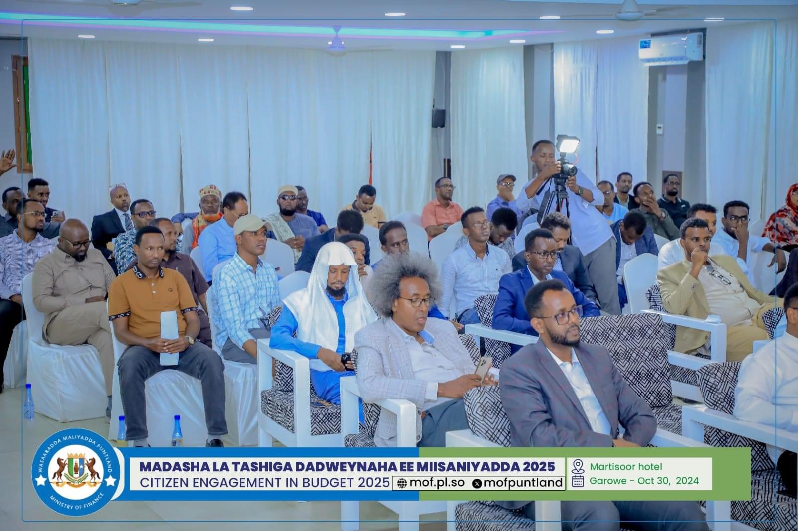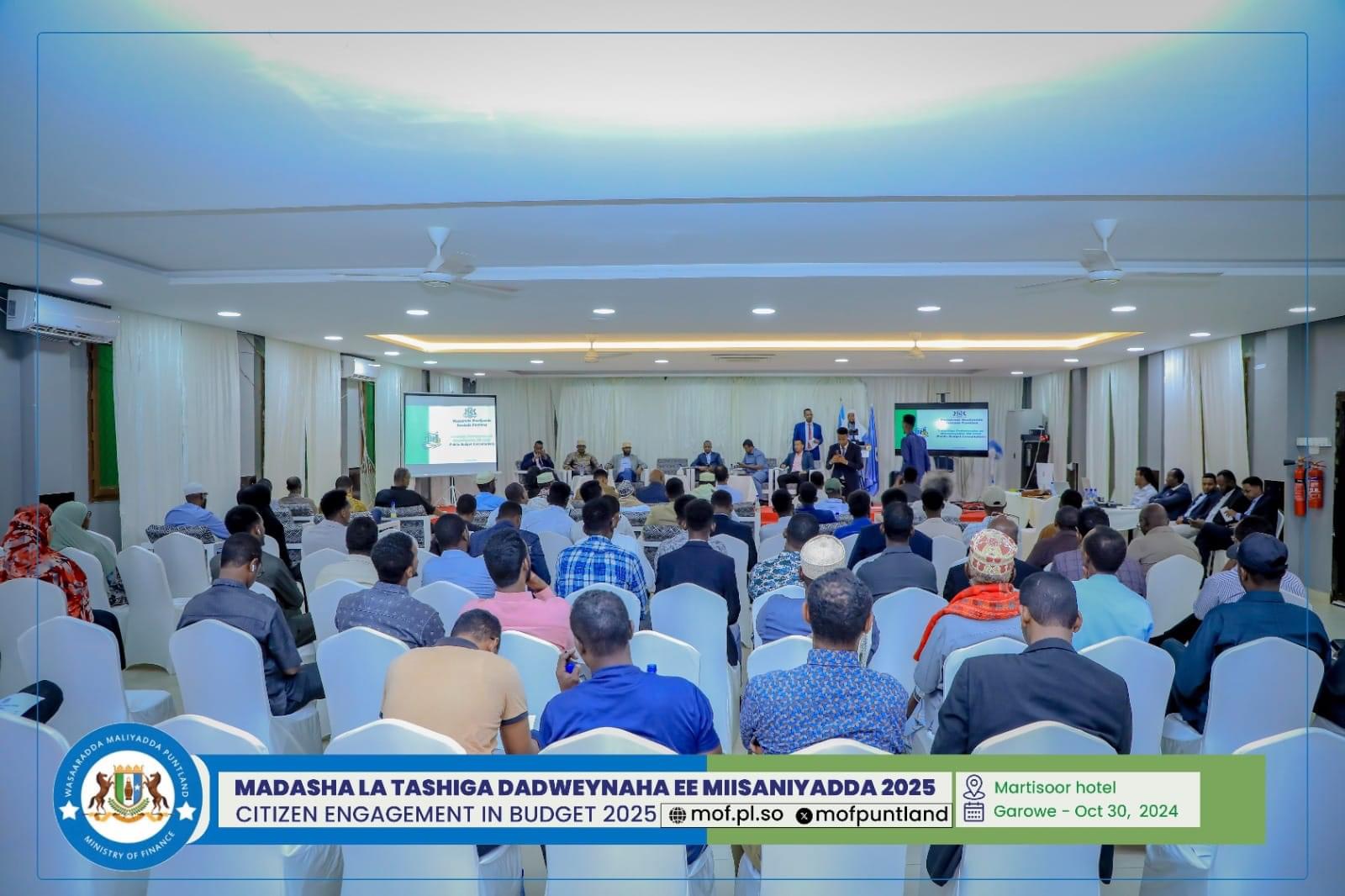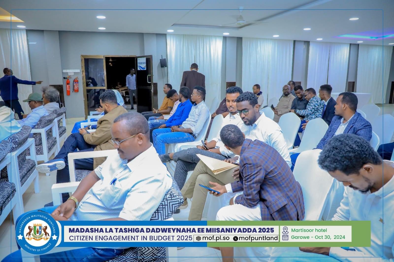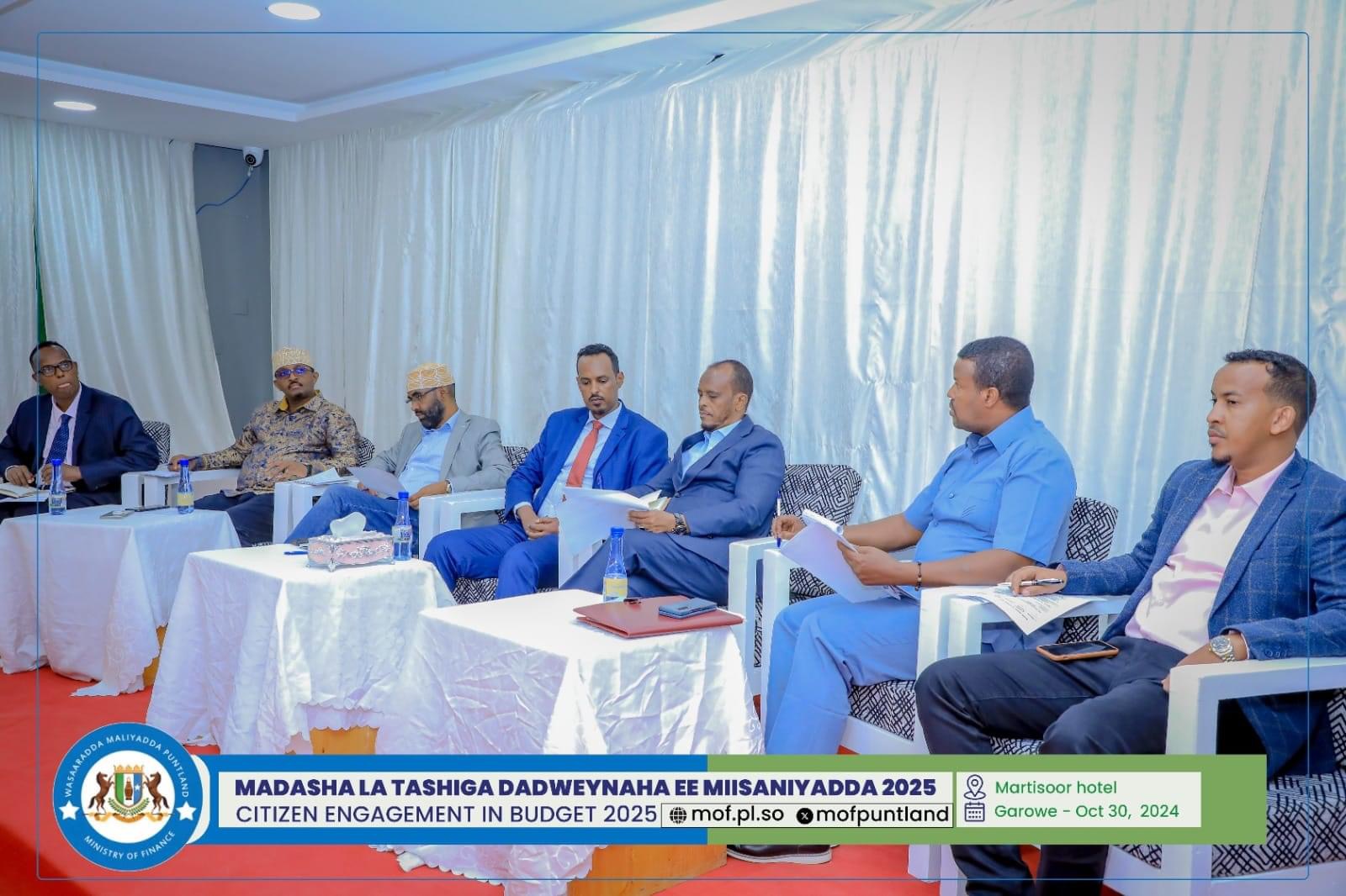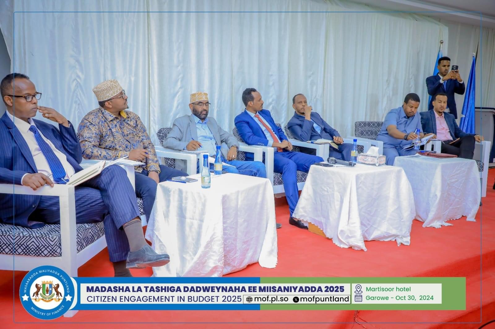 GAROOWE – Madasha la latashiga Dadwayanaha ee Miisaaniyadda Dowladda Puntland 2025 ayaa ka furmay hoolka shirarka ee Martisoor Hotel Garoowe.